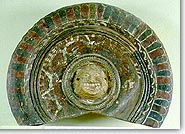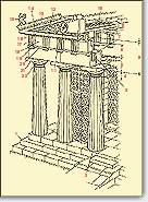 The part of the building over the walls and the columns, the entablature, comprised the architrave, the frieze and the cornice. Initially, the entablature was either made wholly of wood, or it was wooden with a ceramic facing. Later on, a part of it was made of stone or marble, but its roofing remained in clay except in some special cases, as in the Parthenon where even that was marble. The roof, wooden or sculptured in stone, usually had the form of decorated successive square set backs, which were called coffers. The two inclining sides of the roof created the pediment, on its narrow sides a triangular space, the back side of which was enclosed by a vertical wall, the tympanum. In the early years, the pediment was decorated by relief representations and later by mainly sculptures. Floral motifs or statues, known as acroteria, were also placed on the six angles of the saddle roof. | ![]() |