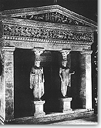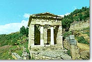 The treasuries were buildings related to temples, and were built near the sanctuaries usually sheltering public (and rarely private) votive offerings. From the point of view of design they are usually small distyle in antis buildings. The most important treasuries were found at the Panhellenic sanctuaries in Olympia and Delphi. They appear either in Doric or in Ionic order. In some cases the Ionic columns were replaced by caryatids, such as in the treasuries of the Cnidians and the Siphnians at Delphi. The latter is dated around | ![]() |