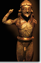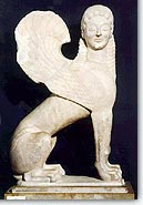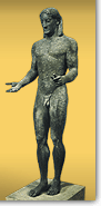 A special style of sculpture owing quite a lot of its elements to oriental influences, had already been developed in Crete at the end of the 8th century B.C. At the same time the structuring of the volumes of the human body was gradually released from the formation and approached a more physiocratic conception. This tendency was expressed through a new technique, hammering. Characteristic examples from the end of this period are the three statues from Dreros, one male and two female, which are usually identified as the Apollonian trinity. They were made of hammered sheets of bronze, which were fixed with nails onto a wooden frame, and apparently constituted the cult statues of the temple of Dreros. During the same period, a similar technique can be found in human-head vases from Idaon cave and in cast statuettes from Cnossus, which verifies that this development was indigenous. With a combined technique (casting and hammering) another cult statue of Apollo Hoplites was apparently made; this was recently found in a temple of the ancient Metropolis, in west Thessaly. Although it is more recent - dated around the middle of the 6th century B.C.- it seems to be related to the same tradition, of that of the bust of Nike from Olympia. Some heads of griffins and lions, also from Olympia, have stronger Ionic influences. |  |
