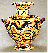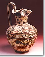 ![]() | Among other workshops we can note those of Rhodes, from which come the "group of Vroulia" with red and white floral motifs over a grey black coating. Some groups of vases with rich representations and careful design, which have been found exclusively in Etruria, were occasionally associated with workshops of eastern Greece. These are the Caeretan hydries, as well as the groups of Northampton and Campana. The latter two groups are associated with Clazomenae, whereas those of hydries to Phocaea. However, the most probable theory is that all these vases were created by ceramists emigrating to Italy, most probably during the time of the wave of migration created by the Persian conquest of Ionia. |