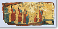 The first truly artistic works that we know from the Archaic period are the clay metopes from the temple of Apollo in Thermon in Aetolia. They are works of a Corinthian workshop with mythological themes. They present many similarities to the Corinthian vase painting of the period, although they cover a broader colour range, and are dated around 630 B.C. From the area of Corinth also come the few examples of great painting of the following century. In Penteskouphia Corinth, a series of clay votive plaques have been found, of the middle of the 6th century B.C., depicting various stages in potteryand are possible offerings of the potters and painters. In the Pitsa Cave, near Sicyon, some wooden paintings were found, dated around 530 B.C. They are covered with a white coating and their figures are made in polychromy. Of these paintings the best maintained depicts a sacrificial scene. |  |