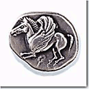 Corinth, as well as Aegina, competed with Athens in trade. It began to mint coins probably around 500 BC. Several scholars have maintained that the first Corinthian coins belong to the time of the tyrant Cypselus around 620 BC, but there is no certain proof thereupon. The Corinthian stater had equal weight with the Athenian didrachm (8,5 grams) and its third denomination was equal to the tridrachm. It was not cylindrical, like the Aeginetan or the Athenian, but on the contrary it was made of even discs. Corinth had chosen the Pegasus and the first letter of the city's name, the Archaic koppa, as its symbols.
