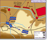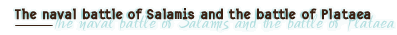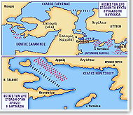 Within eight days of the battle of Thermopylae, the Persian army was on the borders of Attica. Themistocles managed to convince the Athenians that they should abandon their city and draw up their fleet in the strait of Salamis, by interpreting the words of the Delphic Oracle as meaning that the Hellenes ought to take refuge behind their wooden wall. The Peloponnesians preferred to put up resistance at the Isthmus, but Themistocles threatened that if the allies did not fall in with his tactics, the Athenians would migrate to Lower Italy. It was on the morning of 29th September that the Persians launched their attack, having blocked the through passages of the strait so as to impede the Hellenes' retreat. As Themistocles had foreseen, they were unable to make the most of their fleet's numerical superiority. By taking advantage of the local currents, the Hellenes either rammed the Persian vessels or, having immobilized them, the hoplites attacked their crews. The Persian fleet was eventually routed in disorder, and took refuge in the anchorage at Phalerum. | ![]() |