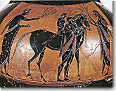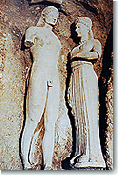 Burial practices indicate that inhumation remained a rite of a clearly private nature. Until the end of the 6th century B.C., we have monumental individual graves, decorated with kouroi and korai, a hymn to the ideal of youth. The name of the dead person is carved on the monument, and a communication is set up between the two worlds, as many epigrams are addressed to the passer-by. Through writing and art, the individual acquires a new access to collective memory. |