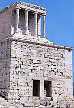 Pausanias tells us that the god to whom the temple was dedicated was "Wingless Victory" (Nike Apteros). The reference is to a cult statue of Athena Nike which showed her with her wings clipped, meaning that she would never be able to desert Athens. The temple was designed by Callicrates and typologically it was a building of the Ionic order with four columns on either front. The pronaos - which was in antis - was integrated with the cella. So there is an impression of greater depth to the building, despite the restrictions of space imposed by the tight site. This temple and the one on the Ilissos are perhaps the earliest examples in Attica of the fully developed Ionian order.