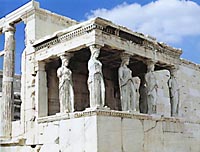 | Work on the Erechtheum started in 421. It was completed, not without interruptions, in 405 B.C. Who was its architect? We do not know his name, but many people think that he was Mnesicles. The Erechtheum belongs to the Ionic order. Its main features are its quirky plan and its complex shape. These were obviously due to its composite functional needs and to the lie of the land. The solutions chosen relied on doing things simply and following the various ground levels. This is evidence that whoever the architect was, he was a person of infinite resource and high skill in blending. |