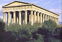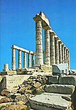 In building the new temple of Poseidon, the remnants of the old one on the same site were used freely. The new temple had a frieze all the way round the architrave of the pteron, and not just round the architrave of the entrance-hall. It had carvings on the pediment (though not on the metope-panels). The corner ornaments had palmettes and spirals. Like the Hephaesteum, the temple of Poseidon had six by thirteen columns (the other dimensions of the two are also comparable), but taller and more slender. Site seems decisively to have influenced design: the temple stood on the summit of a headland and was intended to be most conspicuous from seaward. |