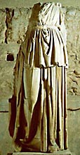 One of the first of the fourth-century sculptors was Praxiteles' father, Cephisodotus, from Athens. His chef d'oeuvre was a statue of Peace with Wealth. Praxiteles himself far outstripped his father in technique, with his willowy, youthful figures full of sweetness and feminine charm, their faces typically delicate and pensive. Praxiteles was the first sculptor to portray the goddess Aphrodite naked (which he did for Knidos). This established a precedent for the female nude which was to last into Roman times. His major sculptures included the Andros Hermes; the Hermes and Dionysus at Olympia; the Horny Satyr; Apollo Slaying the Lizard; and the Arles Aphrodite. The Marathon ephebe and the small and large versions of the 'Woman from Heraclea' have also been thought to be from Praxiteles' workshop. |