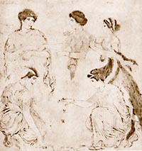 Apollodorus the Athenian, who was working towards the end of the Zeuxis' great rival was Parrhasius from Ephesus, who relied exclusively on line to convey volume - a technique familiar to us from the white-ground lekythos. Sometimes, apparently, Parrhasius joined forces with leading toreuts to design vases of metal embellished with compositions with several figures. |