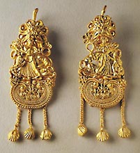 The main raw material for jewelry was gold. It came from Asia Minor, Colchis, or Macedonia: there were gold mines on Siphnos, but they had ceased to function by the beginning of the Classical period. The Athenians worked a number of gold mines in the Pangaeum region, also obtaining gold from other sources by trading. Their silver requirements were for a long time met by the output from Laurium. No gold or silver jewelry has yet been found in Attica to match the silver ring bezel from Epirus: this is certainly due to the special type of burial practices. We must assume, nevertheless, that such jewelry was being made at Athens in Classical times. We can get some idea of the rich jewelry styles of our period from the finds at nearby Eretria, which include elaborate earrings with subjects from mythology; necklaces with pendants (perihapton) in the shape of animal heads; and rings with engraved bezels. |