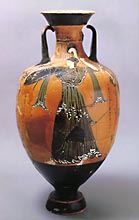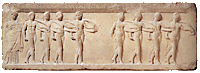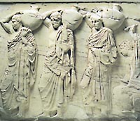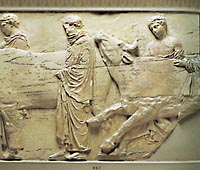 The peplos was a huge rectangular textile showing the Gigantomachy ('Battle of Gods and Giants'). It was woven every year by women of Athens - the so-called ergastinai under the supervision of the woman priest of the god. This was the same subject that appeared on the pediment of the temple of Athena on the Acropolis in Pisistratus' time. It was linked with the myth of the distinguished part played by Athena in the Battle of the Gods and the Giants. The textile was unfurled like a sail on a ship-on-wheels. The ship made its way through the Agora. When it reached the Areopagus hill, the peplos was taken down and carried onward by hand, to be entrusted to the male priests who had the task of wrapping it round the god's likeness. Those who took part in the procession were women (kanephoroi) with baskets of offerings for the god; elderly men (thallophoroi) holding branches of olive; young male riders and other males (skaphephoroi) with vessels called skaphai; and women or young girls (hydriaphoroi) carrying a water-jug on the shoulder. The donation and transport of these vessels was a metic privilege. In the procession there were also Athena's sacrificial animals - she-goats, rams, bulls, cows, and sheep. It is the procession of the Great Panathenaea which has been seen by most scholars as the scene portrayed on the Parthenon frieze. |
