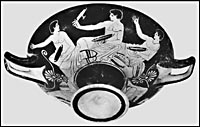The kottabos, a favourite game at symposia in Classical Athens, was a game of manual dexterity. The symposiast took aim at an agreed target (usually a household utensil) and flicked the lees out of the bottom of his glass, uttering the name of a loved one. If his wine landed in the utensil, he was sure to be lucky in love. At a symposion the kottabos game was often played by the hetairai as well.